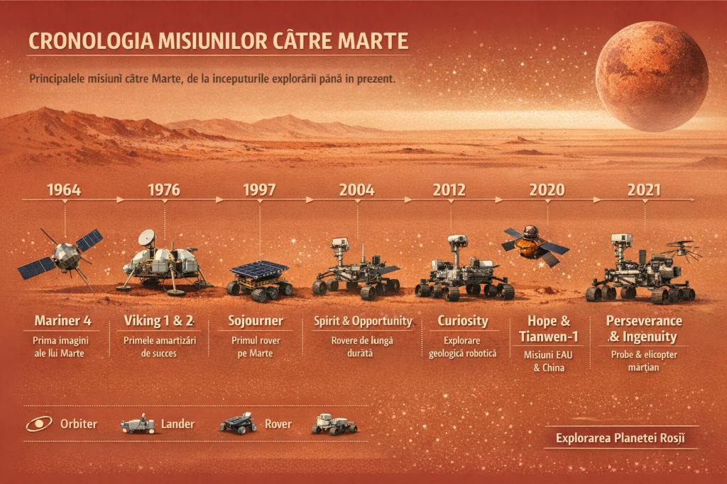 Explorarea planetei Marte constituie, de peste şase decenii, o poveste în care se împletesc curiozitatea ştiinţifică, riscul tehnic şi colaborarea internaţională. De la primele încercări practice din anii 1960 până la flotila modernă de orbitere, landere, rovere şi experimente aeriene, programul global de explorare marţiană a evoluat de la observaţii telescopice şi misiuni de reconstrucţie a mediului la strategii sofisticate de căutare a urmărilor vieţii şi pregătire pentru prezenţa umană.