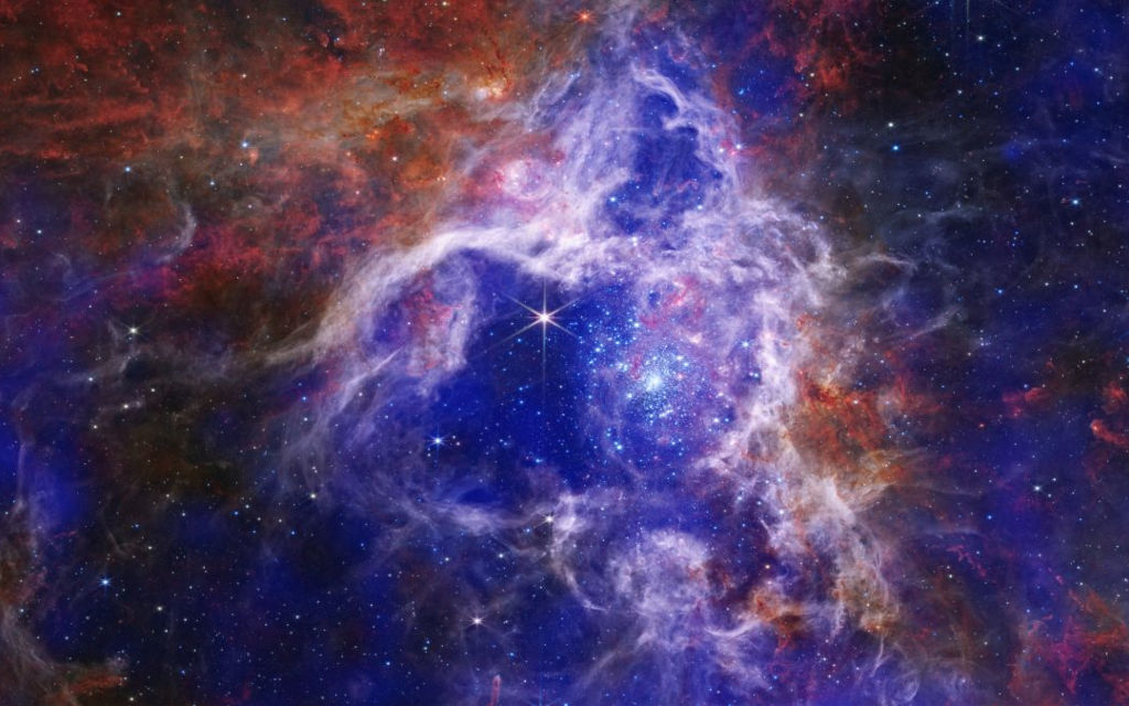 O astfel de stea tânără, denumită ST6, este situată la circa 160.000 de ani-lumină față de noi, într-o superbulă denumită N158 – nu departe de Nebuloasa Tarantula. Cercetătorii au utilizat Telescopul Spațial James Webb pentru a studia lumina din domeniul infraroșu mijlociu din materie înghețată ce se rotește în jurul stelei pentru a-i stabili compoziția chimică. (Moleculele organice complexe absorb lumina la lungimi de undă specifice, producând linii spectrale ce pot fi comparate cu cele ale moleculelor cunoscute.)