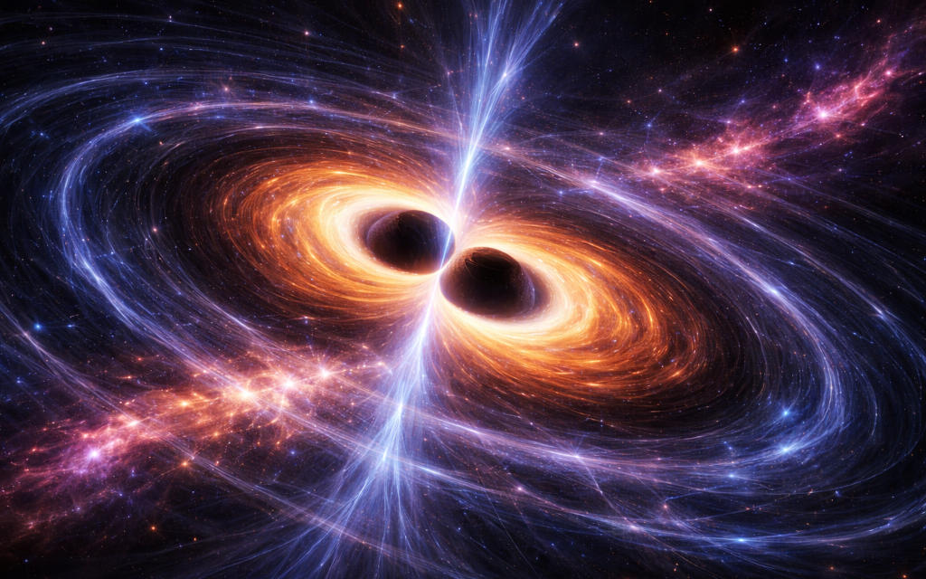 Când două găuri negre orbitează una în jurul celeilalte, ele pierd energie prin unde gravitaționale, apropiindu-se treptat. În ultimele fracțiuni de secundă înainte de fuziune, vibrațiile spațiului ating intensități maxime, generând un semnal caracteristic detectabil pe Pământ.